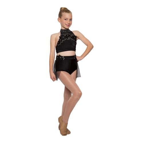 Bold and expressive, the Connie in Black is a striking dance costume designed for lyrical and contemporary performances. Crafted from sleek black lycra, this elegant two-piece set includes a chic crop top and high-waisted shorts, detailed with delicate lace motifs and sparkling rhinestones that shimmer under the spotlight.