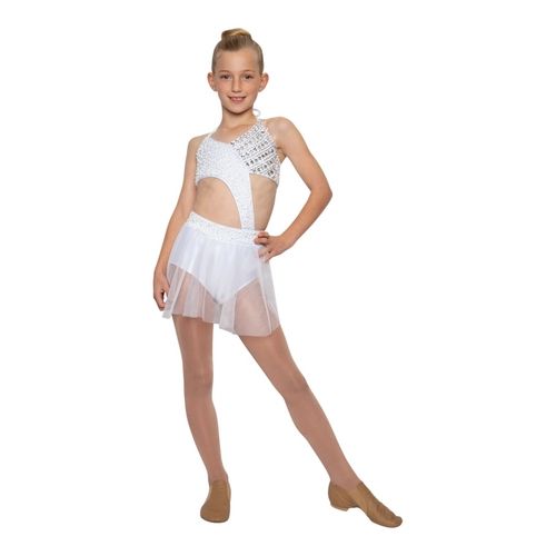 The design is completed with a flowing white circle mesh skirt, enhancing every movement with softness and fluidity. Perfect for lyrical, contemporary, or jazz routines, the Charlotte in White blends bold design with delicate detailing, ensuring dancers shine with poise and confidence.