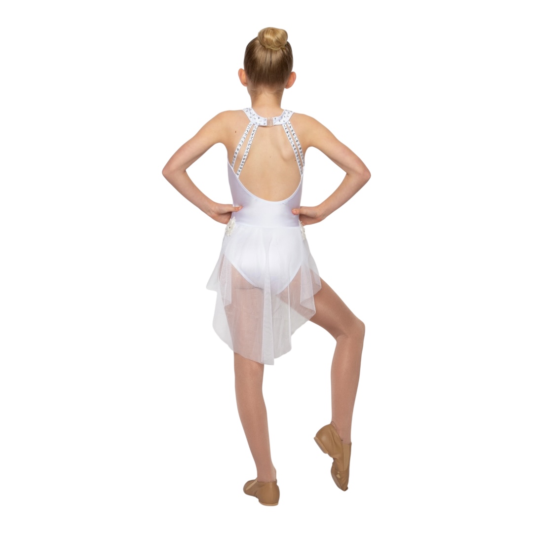 The design is finished with a flowing white mesh skirt, adding softness, elegance, and fluid movement to every step, turn, and leap. Blending comfort with stage-ready style, the Josephine in White ensures dancers shine with poise, confidence, and expressive artistry.