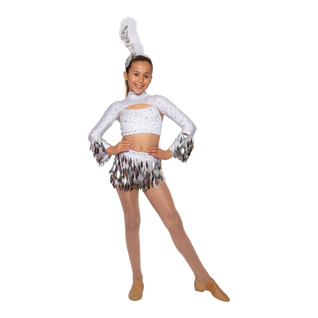 Shine with elegance and energy in the Shake Your Groove Thing costume in brilliant white – the perfect choice for jazz, tap, and high-energy performances. This dazzling 3-piece set includes a sparkling rhinestone crop top, a shimmering white sequin cropped shrug with dramatic flared sleeves, and sleek high-waisted lycra shorts for a polished, comfortable fit.